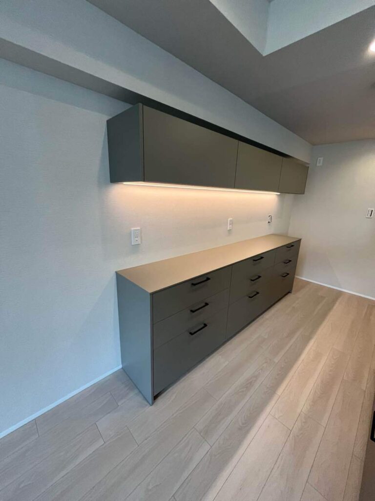 新築建売り戸建てをご購入されたお客さまから、カップボード設置のご依頼をいただきました。 キッチンはグラフテクトのものでしたので、カップボードも同じもので揃えています。 ウォールキャビネットの奥に間接照明があるため、調理家電を使う際も便利で、高級感があり見た目もとてもおしゃれになっています。